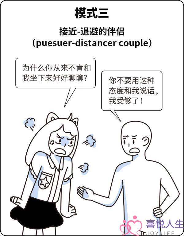 在依恋类型理论中,这是“痴迷型”和“疏离型”的结合。在ta们当中,总会有一方试图接近,而另一方不断退避。但两个人的反应都会促成两个人形成互动的循环:正是一方的接近促成了另一方的退避,也是一方的退避促成了另一方的接近。