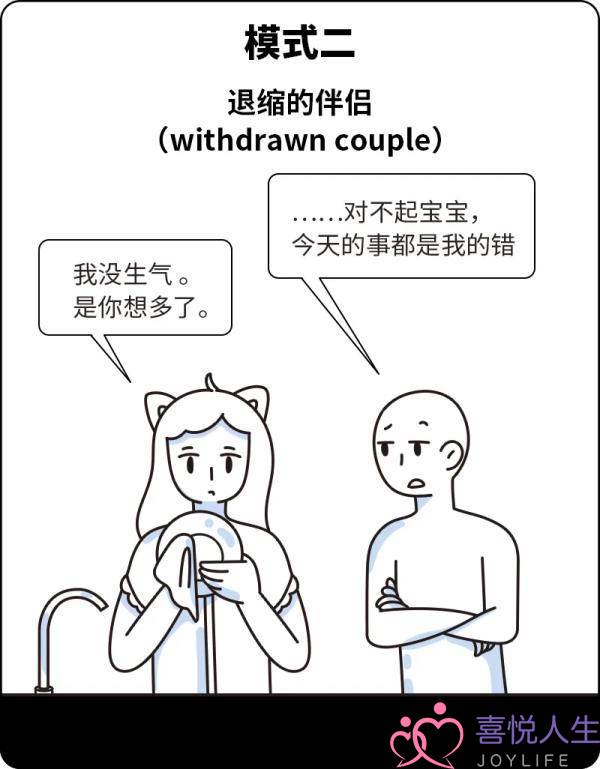 Ta们是互相回避的一对,被称为“没有冲突的伴侣”。在依恋类型理论里,ta们往往都是“回避型”。在表面上,ta们双方对关系都很满意,很少有直接的冲突,但没有真正的情感交流。